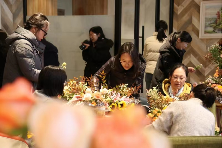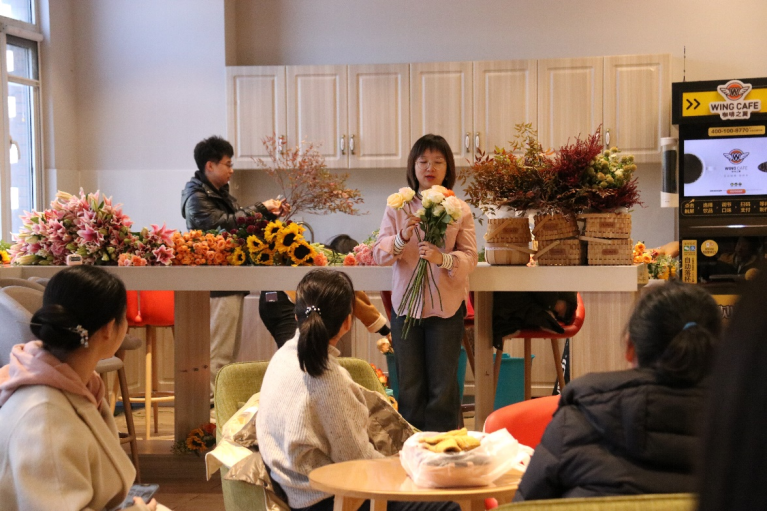 当天中午,学院一楼咖啡厅花香扑鼻、色彩斑斓。在专业花艺师为大家讲解了常见花材品种、等级、习性与养护等基础理论知识后,现场师生投入到艺术构思和实操练习中。大家修剪枝叶、搭配颜色、设计造型,亲手制作出一件件充满匠心和个性花艺作品。大家纷纷举起手机相机、拍照留影,定格这一温馨美好时刻。(文/佘蕙文 图/蒋芙薱)