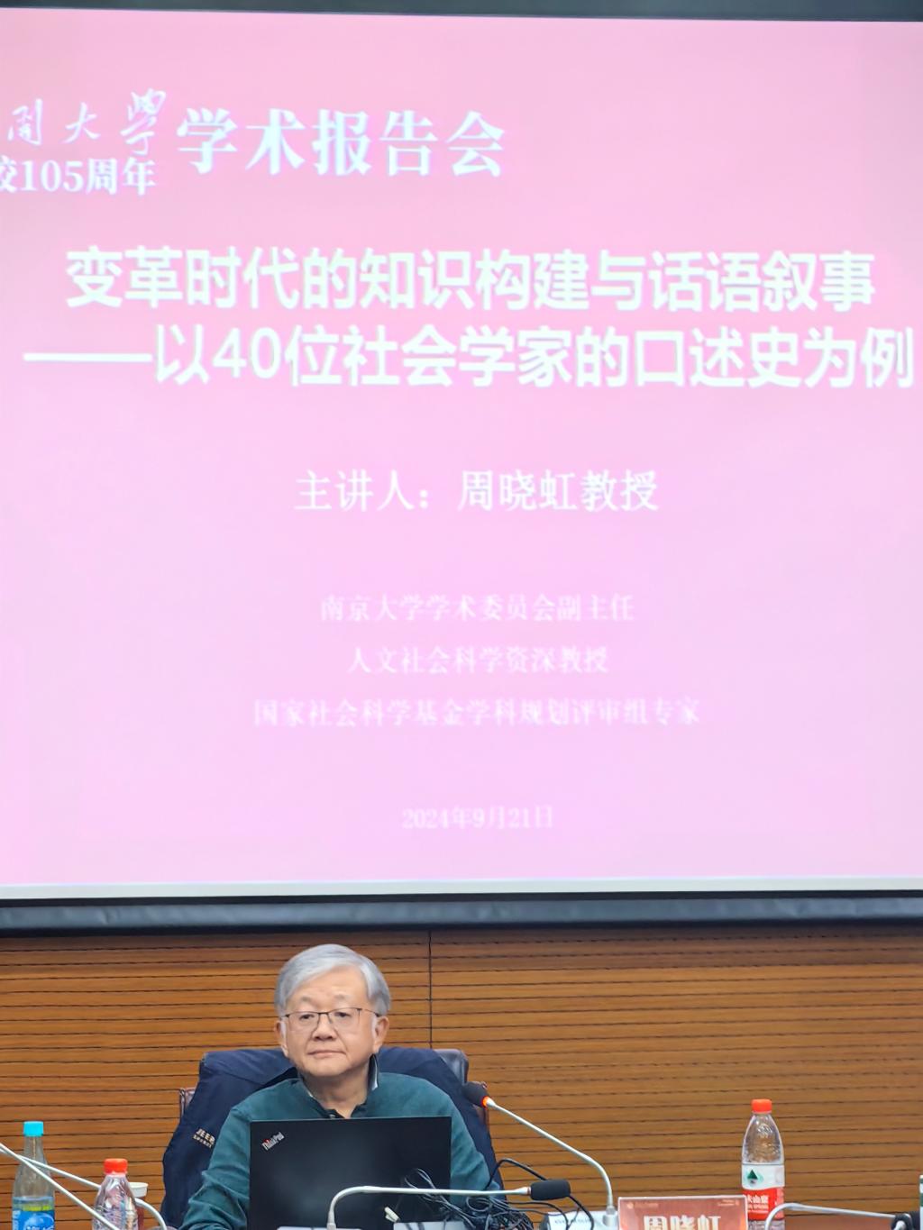 2024年9月21日,bw必威西汉姆联举办了庆祝Betway体育西汉姆联建校105周年的学术报告会。受bw必威西汉姆联邀请,南京大学学术委员会副主任、人文社会科学资深教授、教育部领军人才项目特聘教授、国家社会科学基金学科规划评审组专家周晓虹教授进行了一场学术讲座。他以“变革时代的知识建构与话语叙事——以40位社会学家的口述史为例”为主题,深度剖析了中国社会学人致力于社会学中国化的不懈努力,特别是现代化浪潮下中国社会学发展进程中的现实基础和文化自觉。讲座由bw必威西汉姆联吴帆教授主持,学院师生近百人参加,全场座无虚席。