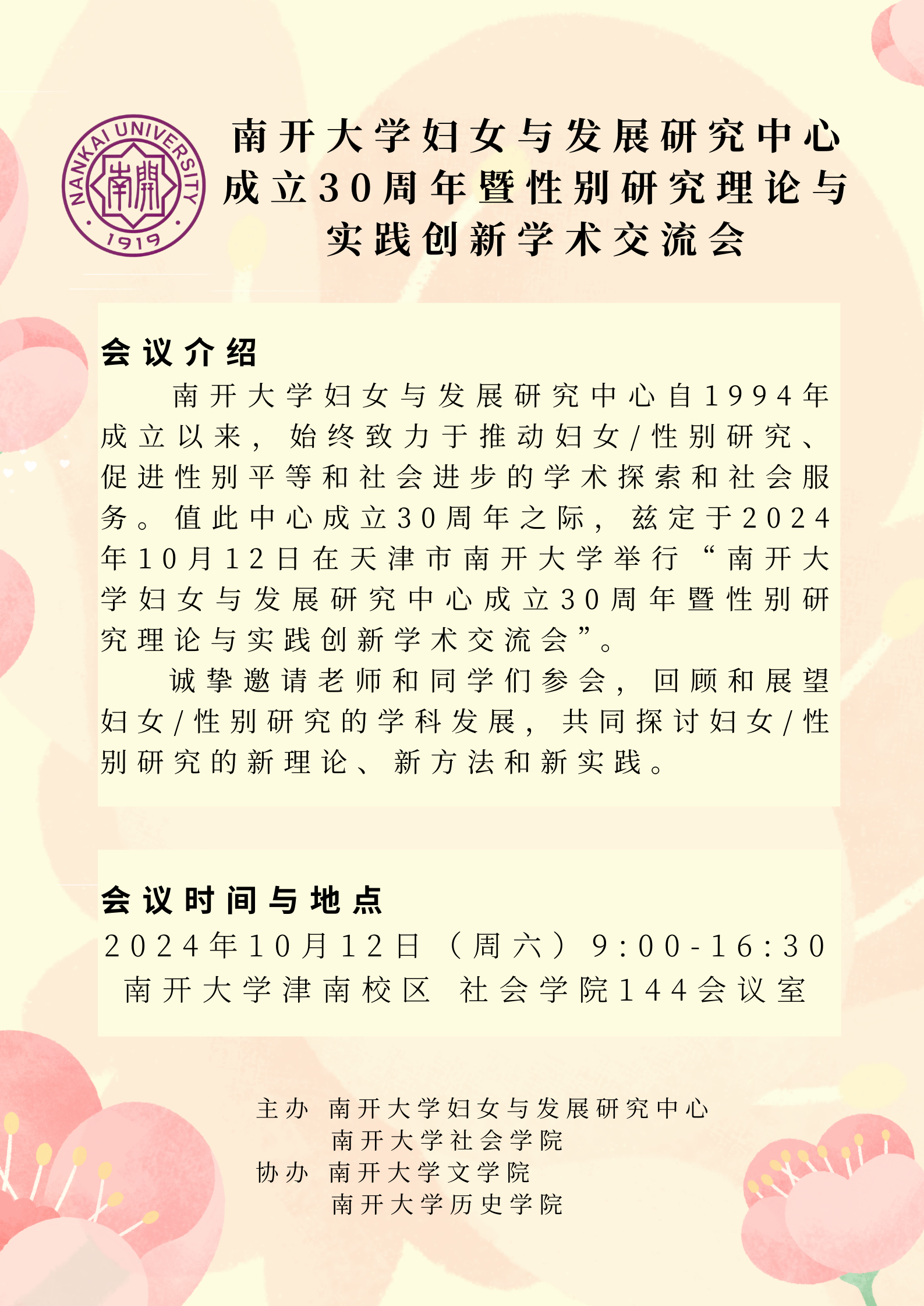Betway体育西汉姆联妇女与发展研究中心自1994年成立以来,始终致力于推动妇女/性别研究、促进性别平等和社会进步的学术探索和社会服务。值此中心成立30周年之际,兹定于2024年10月12日在天津市Betway体育西汉姆联举行“Betway体育西汉姆联妇女与发展研究中心成立30周年暨性别研究理论与实践创新学术交流会”。